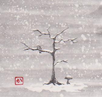 The deep silence in this haiku is palpable. This is an exceptional example of the power of “show not tell” in haiku. In this moment, we can hear the snowflakes falling onto the plants in the garden. There are no other sounds. Because of the delicate nature of snowflakes and plants, they further amplify the silence and deepen it.